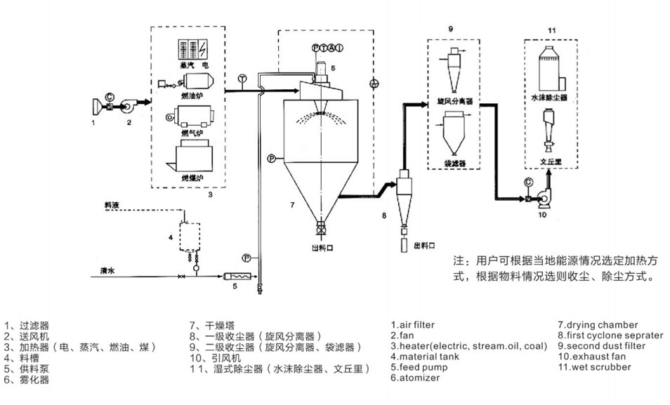 噴霧干燥機(jī)為開式循環(huán),并流式,離心式霧化。干燥介質(zhì)空氣經(jīng)過初、中效空氣過濾器過濾后根據(jù)操作指令由鼓風(fēng)機(jī)吸取再經(jīng)加熱器加熱通過高效過濾器的熱風(fēng)分配器進(jìn)入噴霧干燥主塔。液體物料根據(jù)操作指令經(jīng)過蠕動(dòng)泵,進(jìn)入高速旋轉(zhuǎn)的離心噴頭,在離心力作用下被分散成小霧滴。在噴霧干燥主塔內(nèi),小霧滴與熱風(fēng)在充分接觸,沿其特定路徑進(jìn)行熱交換后被干燥成為產(chǎn)品,然后通過旋風(fēng)分離器實(shí)現(xiàn)分離,固體物料被收集,氣體介質(zhì)再經(jīng)過過濾后被排出。整套噴霧系統(tǒng)易清潔、無死角,符合GMP要求。